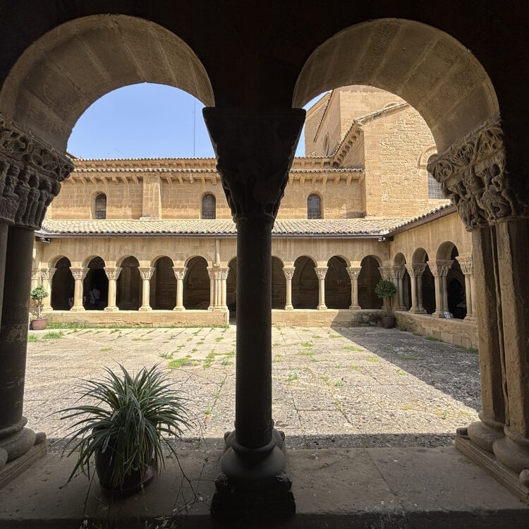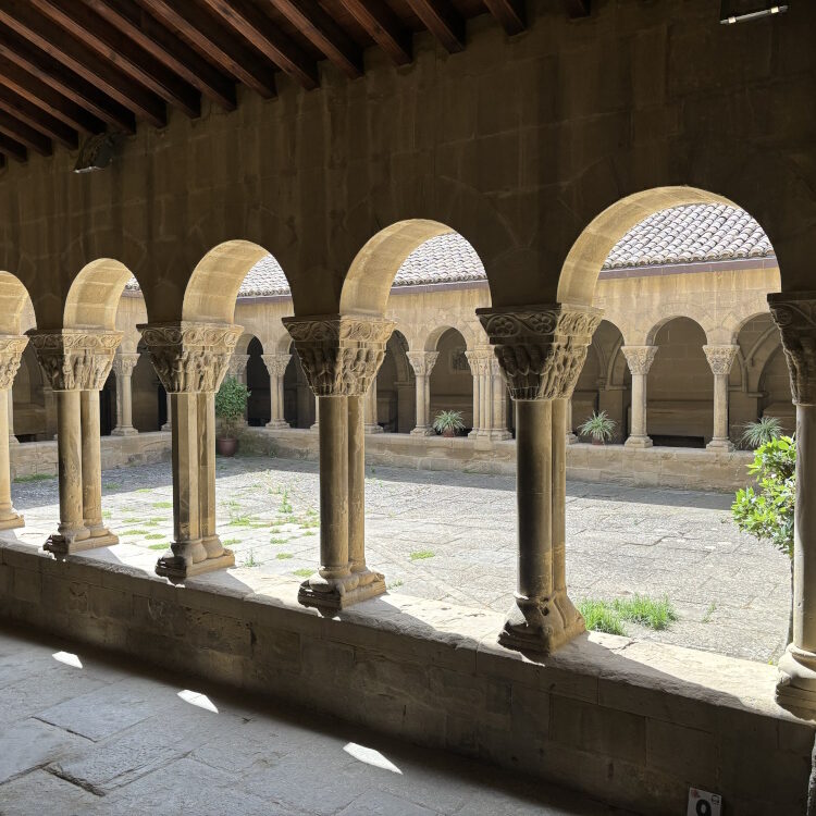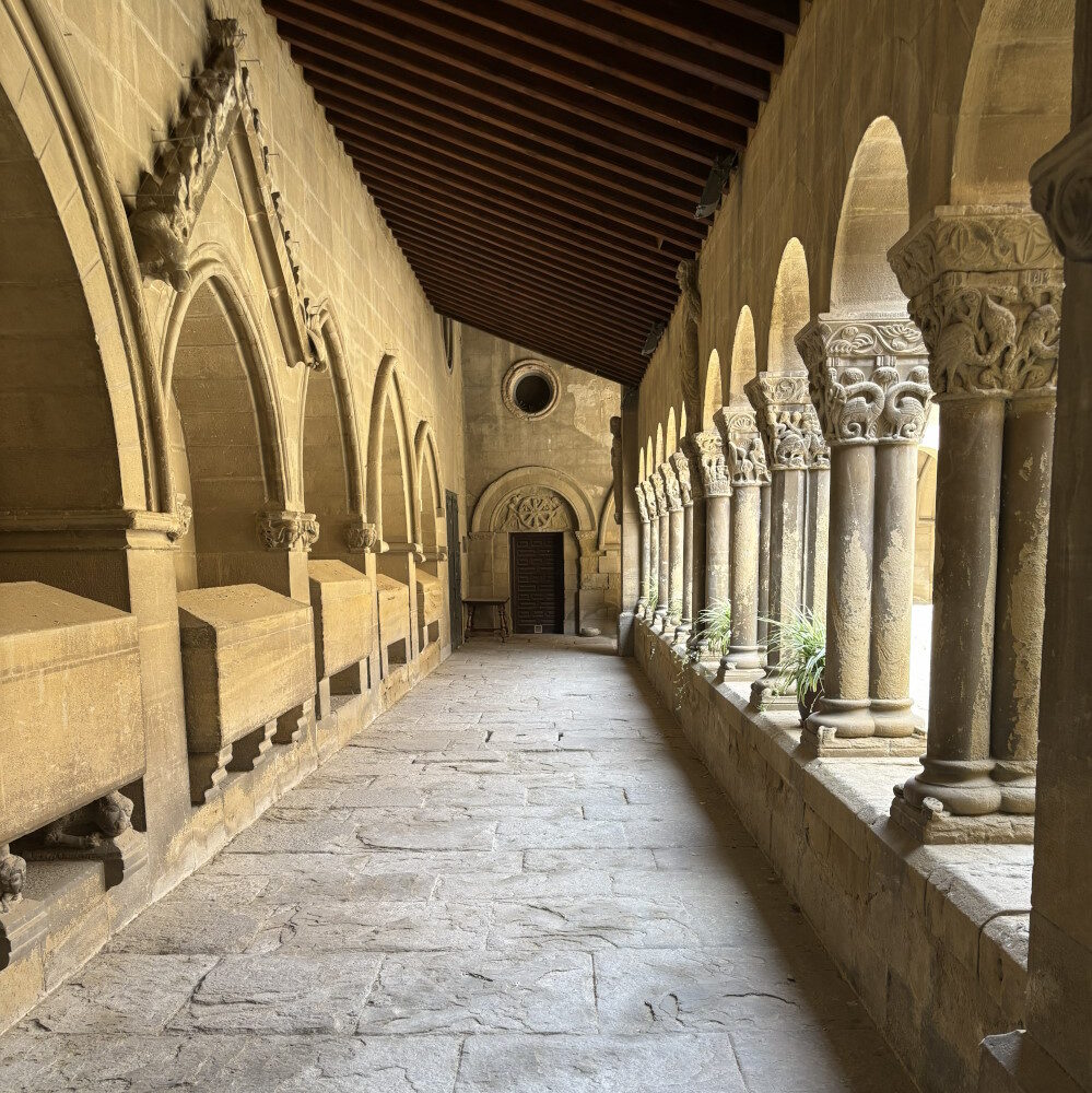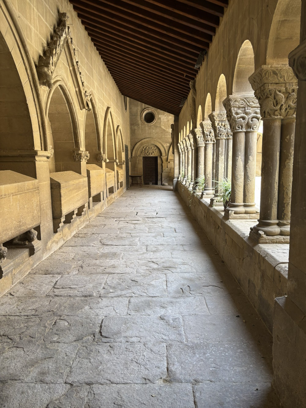 De kloostergang (claustro) is zonder twijfel het hart van het complex. De stenen zuilen, elk met unieke beeldhouwwerken, vertellen bijbelse verhalen en symbolische taferelen die de middeleeuwse geest weerspiegelen.