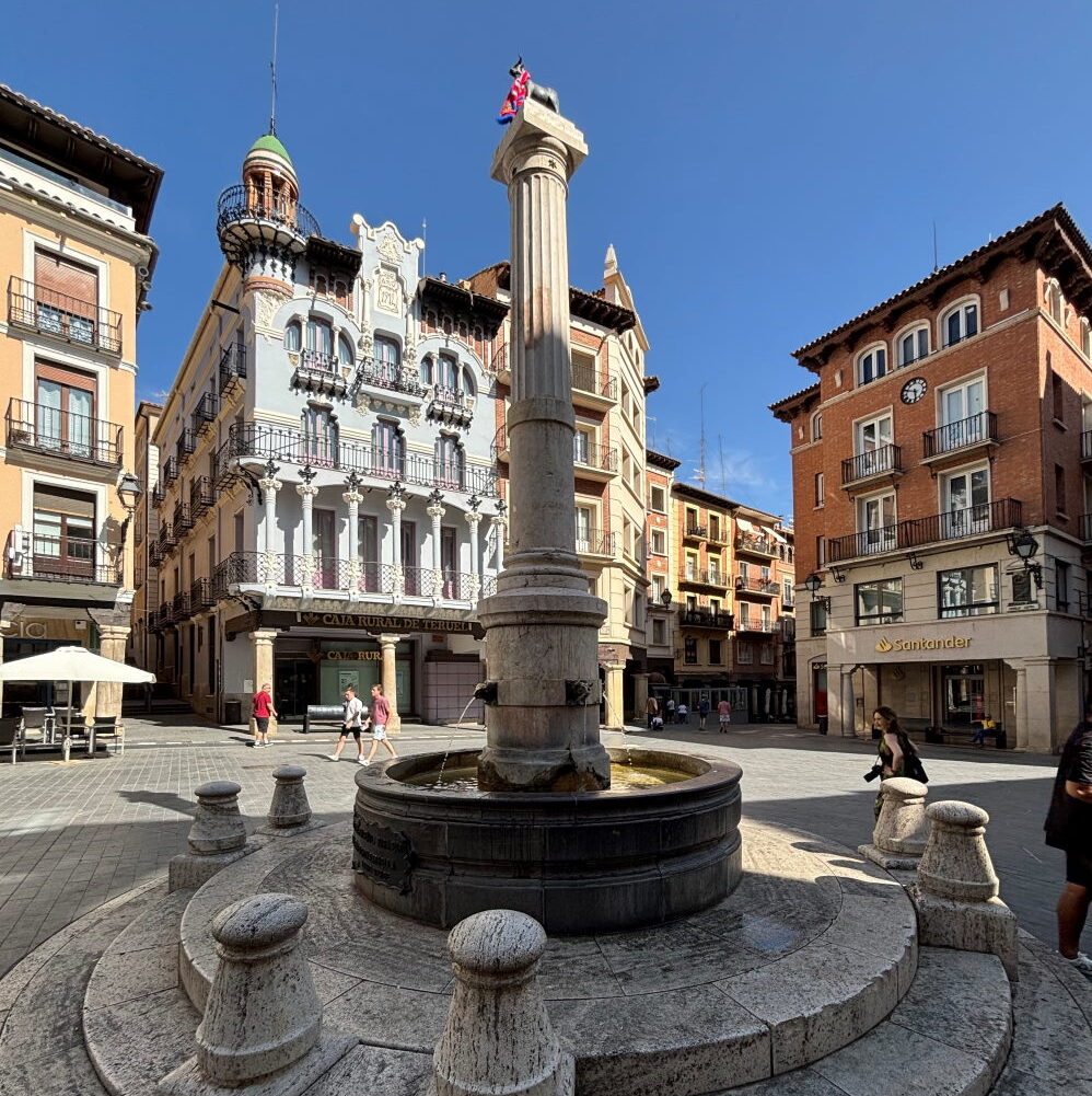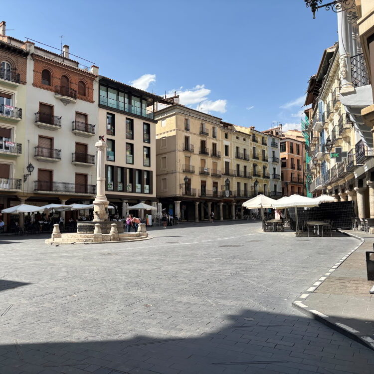 Rondom het plein vind je elegante historische gevels, gezellige cafés en tapasbars waar je kunt genieten van lokale specialiteiten, zoals Jamón de Teruel en een goed glas wijn.