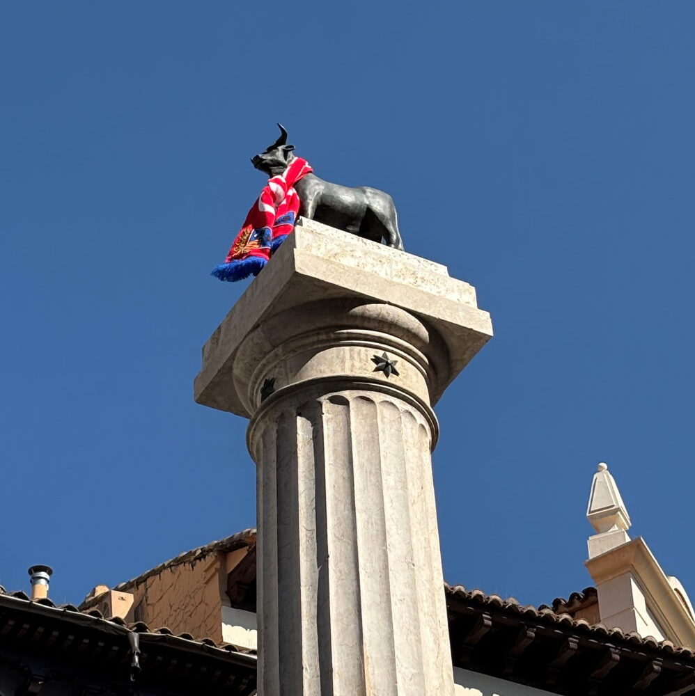 Midden op het plein staat het kleine maar iconische beeldje van de stier (“El Torico”), dat symbool staat voor Teruel.